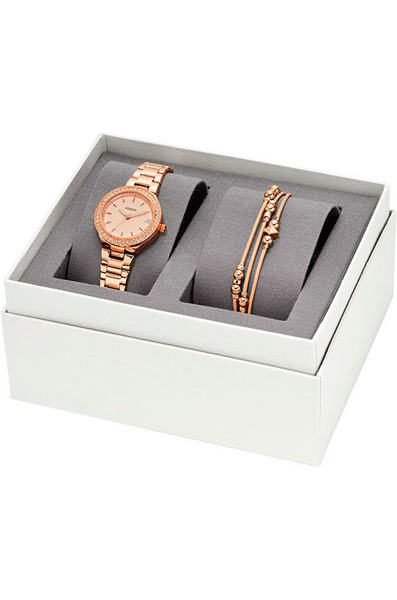Женские кварцевые наручные часы Fossil ES4337SET. На данной модели отображается дата. Корпус украшен кристаллами. В комплекте с часами имеется браслет. На корпус часов нанесено стойкое PVD покрытие.