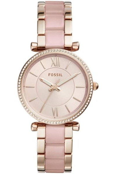 Женские кварцевые наручные часы Fossil ES4346. Корпус украшен камнями. Браслет выполнен из стали с пластиковыми вставками. Нанесено стойкое PVD покрытие.