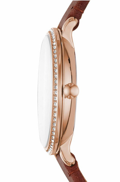 Женские кварцевые наручные часы Fossil ES4413. На корпус нанесено стойкое PVD покрытие. Ремешок — телячья кожа. Циферблат и корпус украшены кристаллами