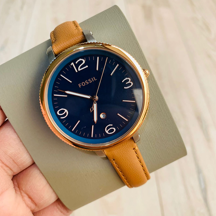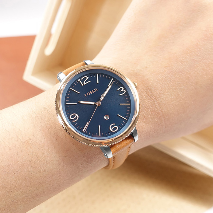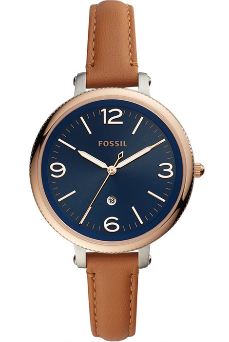 Женские кварцевые наручные часы Fossil ES4923 коллекции Monroe. Кожаный ремешок. На корпус частично нанесено стойкое PVD покрытие. На данной модели отображается текущая дата. Водонепроницаемость WR50 (5 атм).