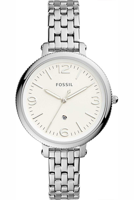 Женские кварцевые наручные часы Fossil ES4924 коллекции Monroe. Стальной браслет. На данной модели отображается текущая дата. Водонепроницаемость WR50 (5 атм).