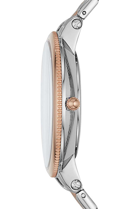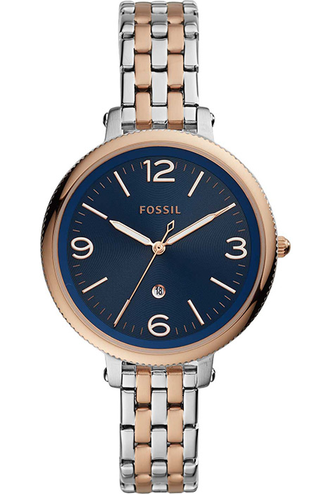 Женские кварцевые наручные часы Fossil ES4925 коллекции Monroe. Стальной браслет. На данной модели отображается текущая дата. Циферблат выполнен по технологии Sunray (солнечные лучи). На корпус и браслет частично нанесено стойкое PVD покрытие. Водонепроницаемость WR50 (5 атм).