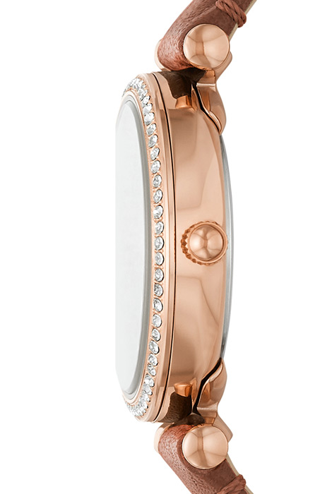 Женские кварцевые наручные часы Fossil ES5112 коллекции Carlie Mini. На корпус часов нанесено стойкое PVD покрытие. Кожаный ремешок. Корпус украшен кристаллами. Водонепроницаемость WR50 (5 атм).