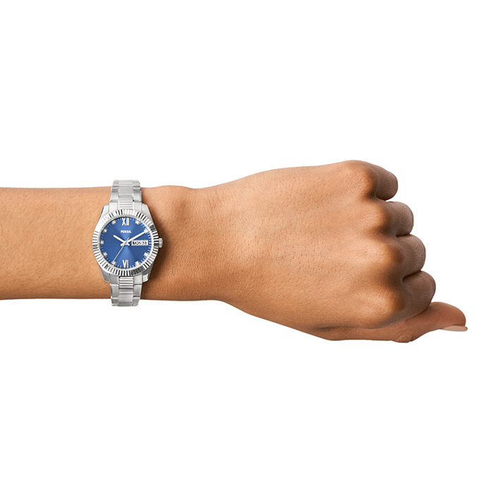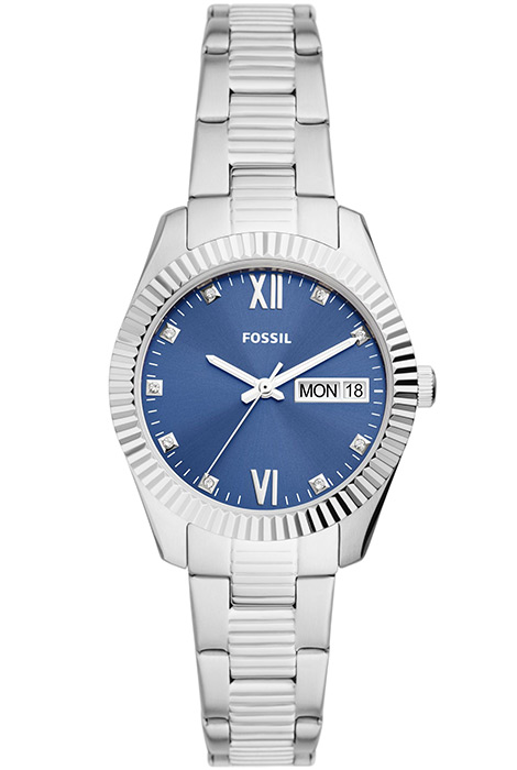 Женские кварцевые наручные часы Fossil ES5197 коллекции Scarlette. Безель с алмазной гранью. Циферблат украшен кристаллами. Стальной браслет. На данной модели отображается день недели и текущая дата. Водонепроницаемость WR50 (5 атм).