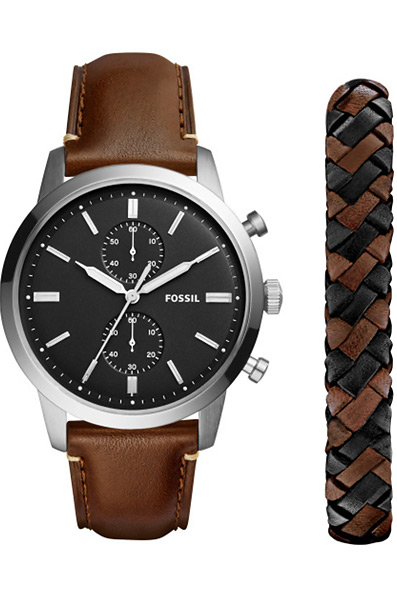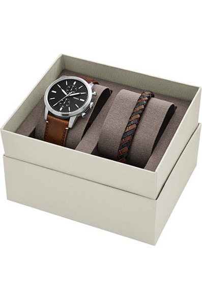 Мужские кварцевые наручные часы с хронографом (секундомером) Fossil FS5394SET. Секундомер может отсчитывать до 60 минут. Водонепроницаемость WR50 (5 атм). Часы комплектуются кожаным браслетом.