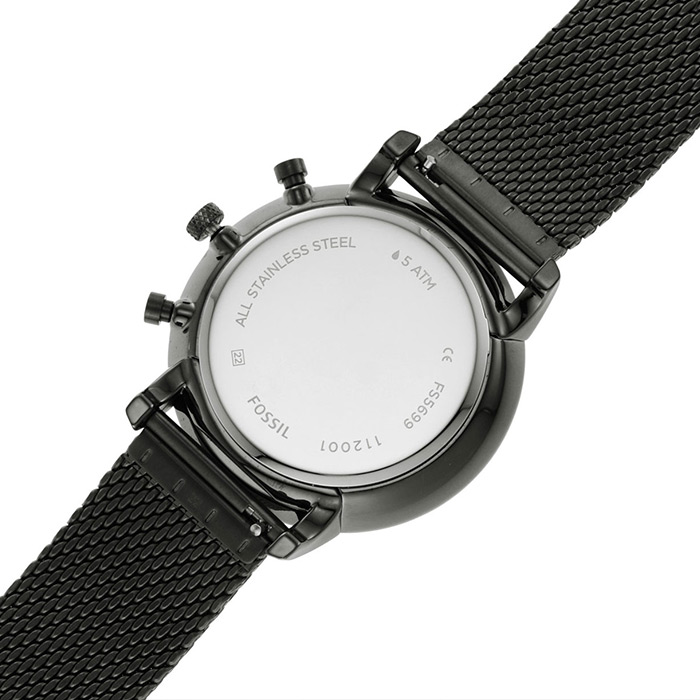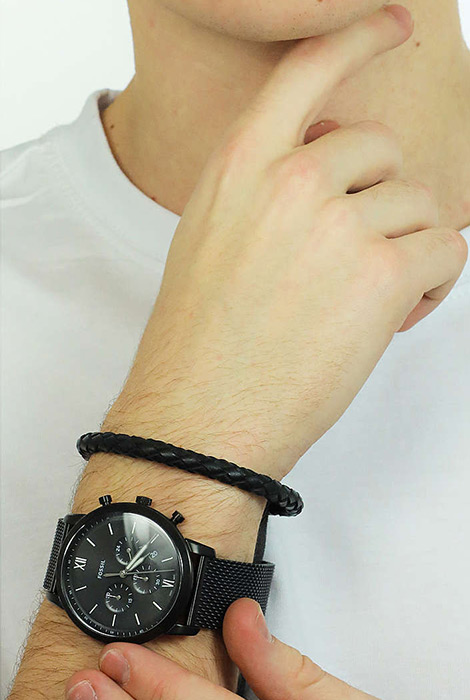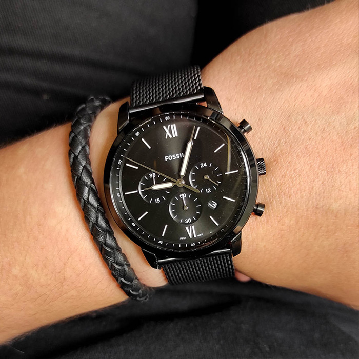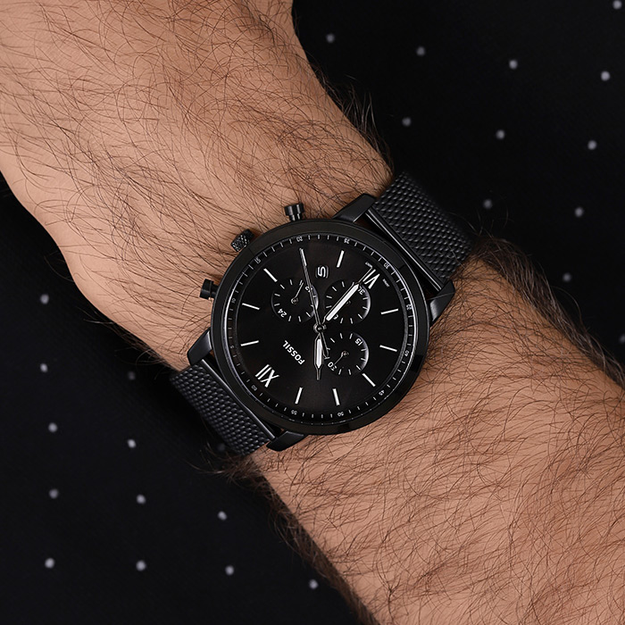 Мужские кварцевые наручные часы с хронографом (секундомером) Fossil FS5786SET коллекции Neutra Chronograph. Секундомер может отсчитывать до 30 минут. На данной модели отображается дата и время суток (24-х часовая шкала). Стальной браслет миланского плетения. На корпус и браслет нанесено стойкое PVD покрытие. В комплекте браслет. Водонепроницаемость WR50 (5 атм).