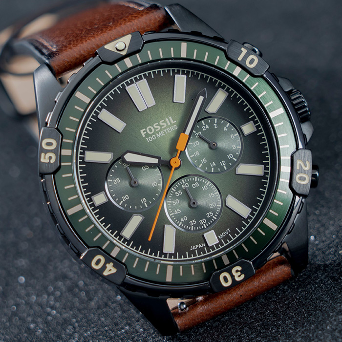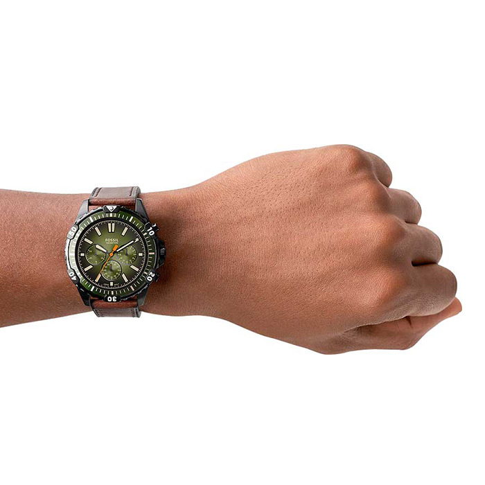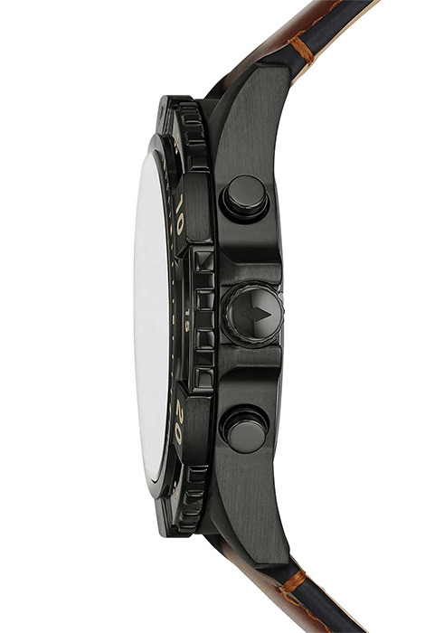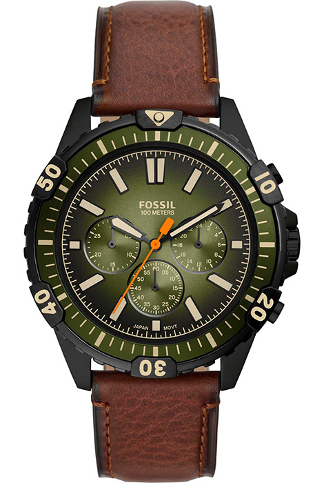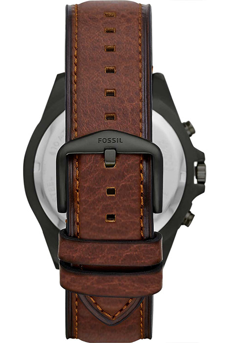 Мужские кварцевые наручные часы с хронографом (секундомером) Fossil FS5866 коллекции Garrett. Секундомер может отсчитывать до 30 минут. На данной модели отображается время суток (24-х часовая шкала). Кожаный ремешок. На корпус нанесено стойкое PVD покрытие. Водонепроницаемость WR100 (10 атм).