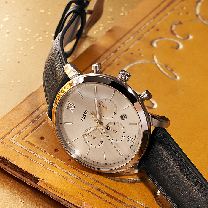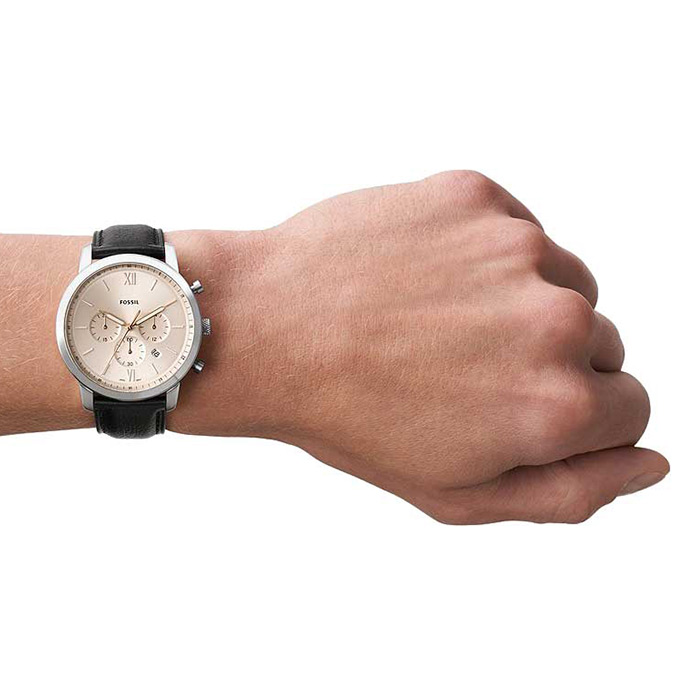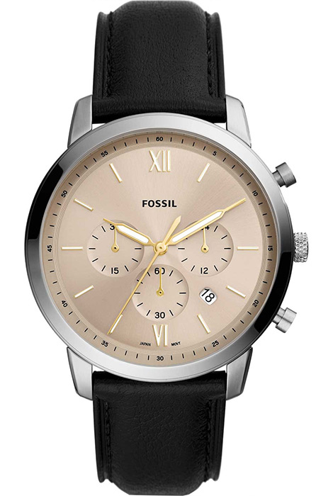 Мужские кварцевые наручные часы с хронографом (секундомером) Fossil FS5885 коллекции Neutra. Секундомер может отсчитывать до 30 минут. На данной модели отображается дата и время суток (24-х часовая шкала). Кожаный ремешок. Водонепроницаемость WR50 (5 атм).