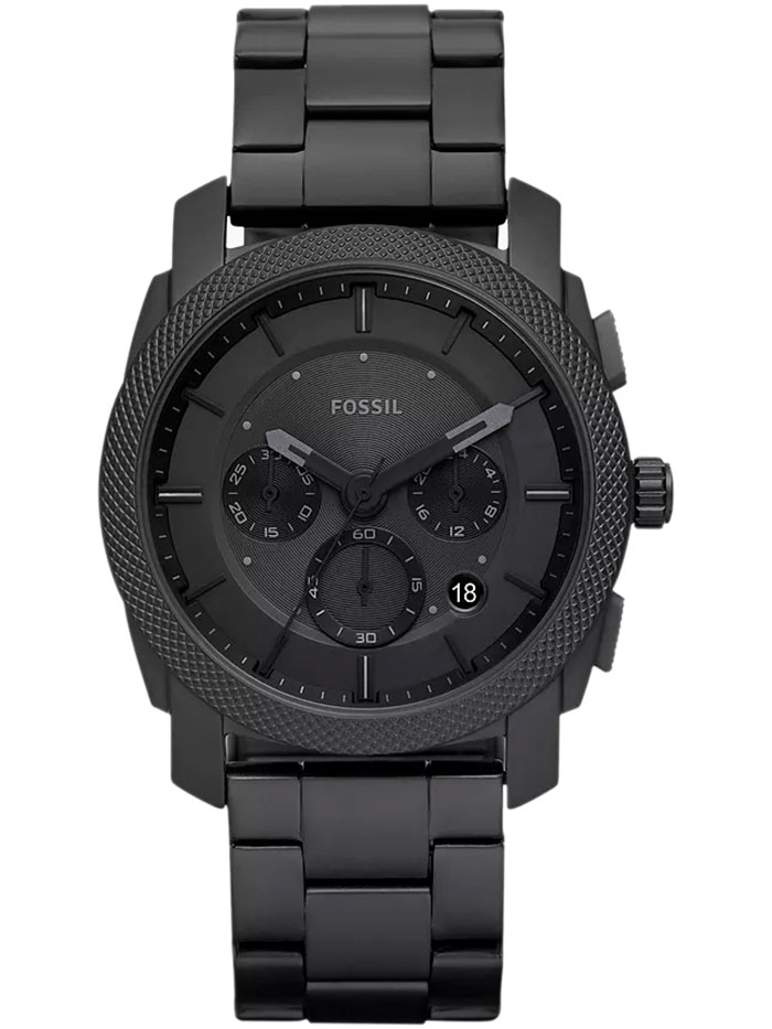 Мужские кварцевые наручные часы с хронографом (секундомером) Fossil FS6015 коллекции Machine. Секундомер может отсчитывать до 30 минут. На циферблате отображается дата и время суток (24-х часовая шкала). Стальной браслет. На корпус и браслет нанесено стойкое PVD покрытие. Водонепроницаемость WR50 (5 атм).