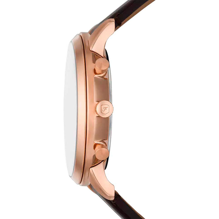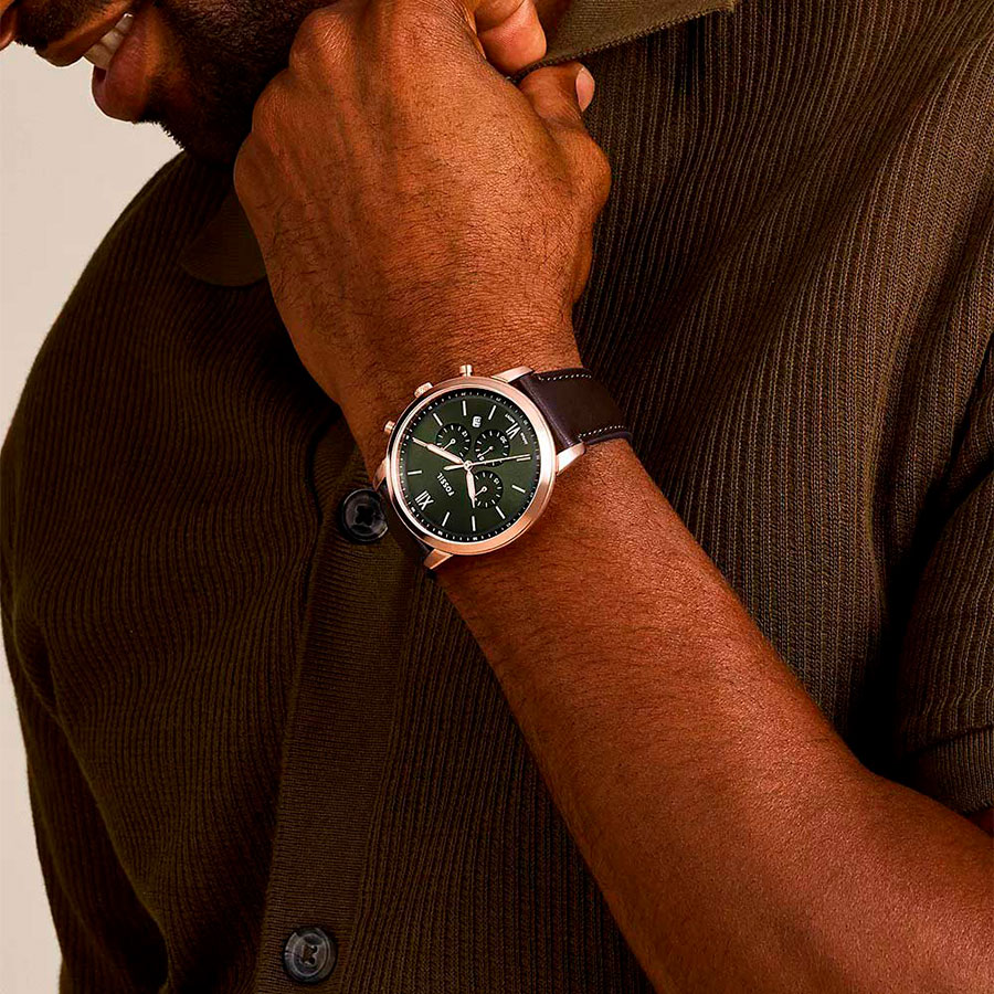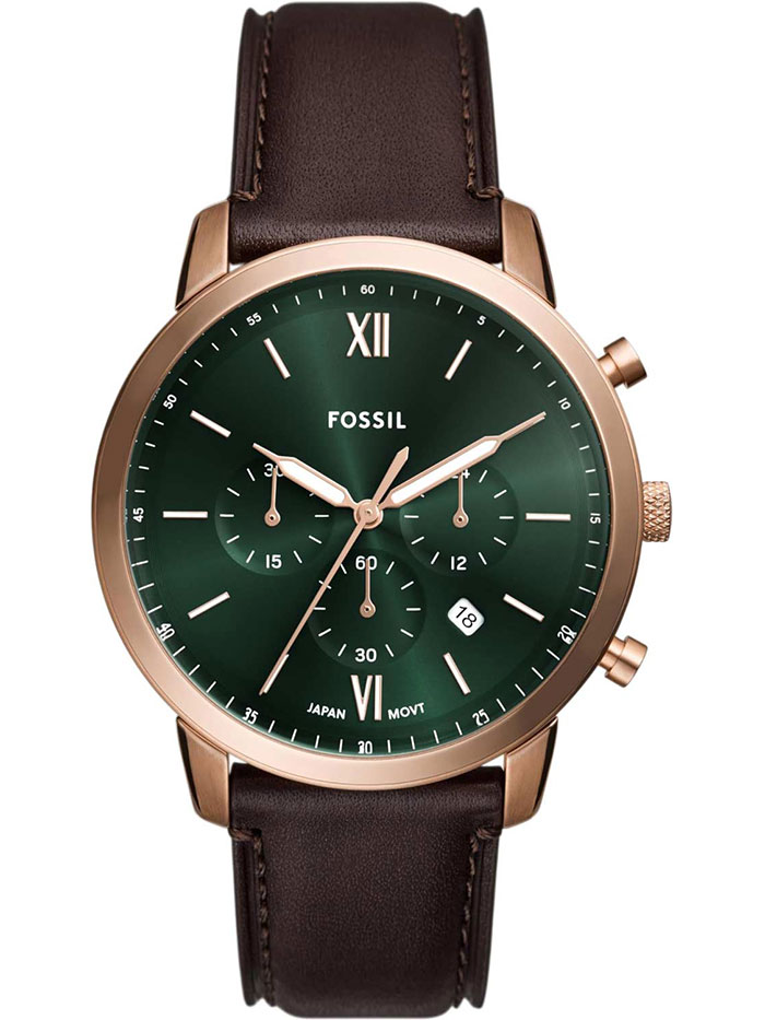 Мужские кварцевые наручные часы с хронографом (секундомером) Fossil FS6073 коллекции Neutra Chronograph. Секундомер может отсчитывать до 30 минут. На циферблате отображается дата и время суток (24-х часовая шкала). Кожаный ремешок. На корпус нанесено стойкое PVD покрытие. Водонепроницаемость WR50 (5 атм).