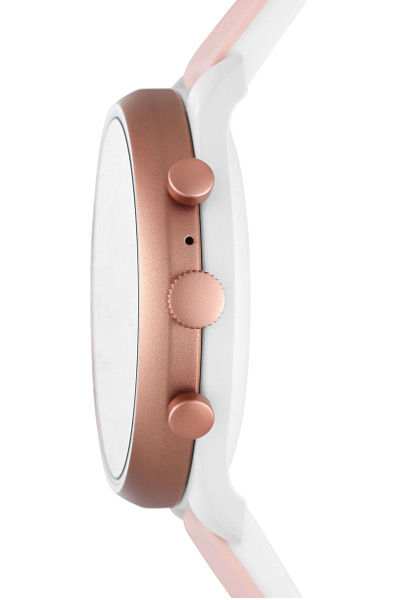 Женские смарт часы Fossil FTW6022 с сенсорным экраном, трекером активности и измерением ЧСС. Поколение GEN 4. В часах установлена операционная система Wear OS by Google, которая имеет возможность соединения с телефонами на базе систем Android ™ 6.0+ (исключая GO EDITION) и iOS 10.0+ с помощью технологий Bluetooth® 4.2 и Wi-Fi 802.11. Функциональность данной модели: при подключении часов к телефону на экран часов можно получать уведомления о звонках, SMS, электронной почты, социальных сетей, календаря и других приложений; функция GPS — отслеживание траектории и пройденного расстояния. Гироскоп, альтиметр (измерение высоты над уровнем моря), акселерометр. Отслеживание активности: шагомер, количество сожженных калорий, измерение частоты сердечных сокращений, секундомер, таймер, создание и отслеживание индивидуальных целей. Автоматическая настройка времени и даты при смене часового пояса (всегда точное время); функция мирового времени и двойное время. Возможность бесконтактных платежей NFC (Near Field Communication). Имеется возможность менять дизайн экрана и кнопок. Встроенный микрофон. Установка приложений из Google Play и голосовой помощник Google Assistant. Хранение и воспроизведение музыки. Технические характеристики: Процессор Qualcomm® Snapdragon™ Wear 3100; Встроенная память — 4 ГБ; Оперативная память — 512 МБ; Аккумулятор — 300 mAh, работает до 24 часов и имеет возможность быстрой зарядки до 80% за 1 час. Силиконовый ремешок с возможностью быстрой замены. На корпус частично нанесено стойкое PVD покрытие. Водонепроницаемость WR50 (5 атм).
