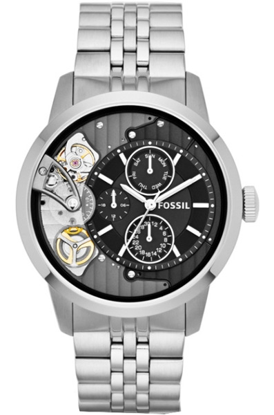 Мужские наручные часы Fossil ME1135. В данной модели установлен механизм Twist. Основной механизм в часах является кварцевым и работает от батарейки. Вторым элементом в данной модели является другая часть циферблата, в которую интегрирован автоматический механизм. Автоматический механизм не предназначен для отображения времени, он приводится в движение при ношении часов и служит для украшения циферблата. На данной модели отображается время суток (24-х часовая шкала), текущая дата и день недели. Водонепроницаемость WR50 (5 атм).