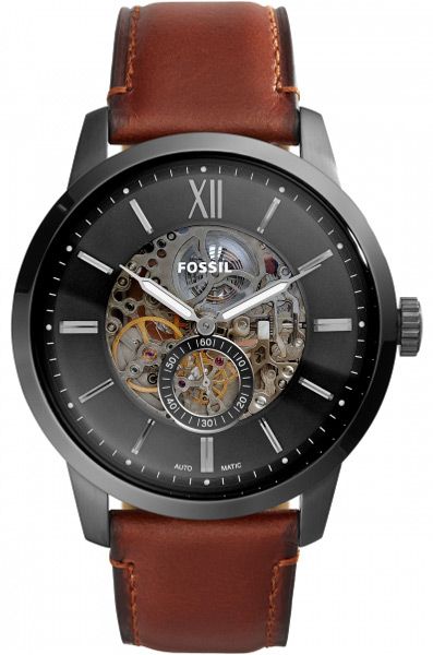 Мужские механические наручные часы с автоподзаводом Fossil ME3181. Данные часы необходимо носить для обеспечения их правильного хода, так как в часах не используется батарейка, а механизм заводится при движении руки. Вращаясь, полукруглый ротор приводит в движение заводную пружину. Корпус скелетон. Кожаный ремешок. Прозрачная завинчивающаяся задняя крышка. На корпус нанесено стойкое PVD покрытие. Водонепроницаемость WR50 (5 атм).