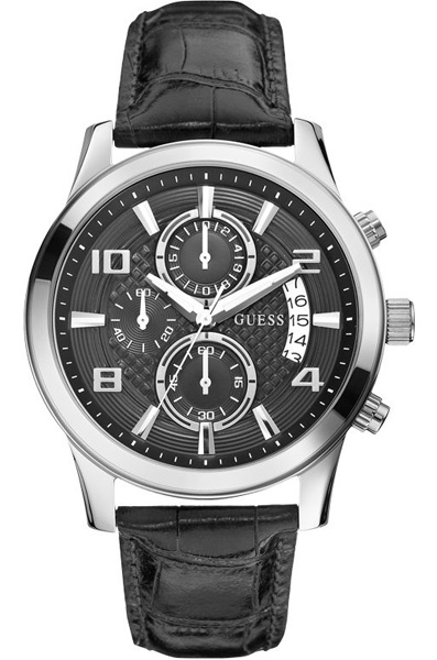 Мужские кварцевые наручные часы с хронографом (секундомером) Guess W0076G1. На данной модели отображается дата. Секундомер может отсчитывать до 60 минут. Стрелки покрыты люминесцентным напылением (светятся в темноте).
