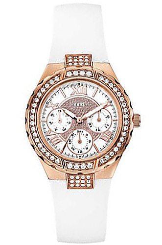 Женские кварцевые наручные часы Guess W0300L2. На данной модели отображается дата, день недели и время суток (24-х часовая шкала). Корпус украшен камнями.