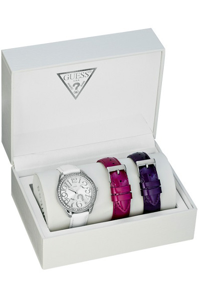 Женские кварцевые наручные часы Guess W11614L1. Данная модель комплектуется дополнительными ремешками. Корпус украшен камнями.