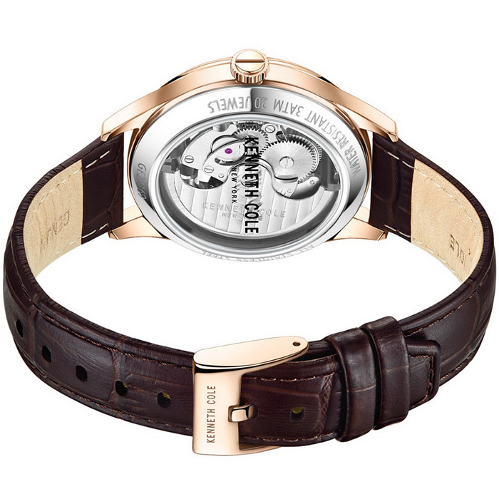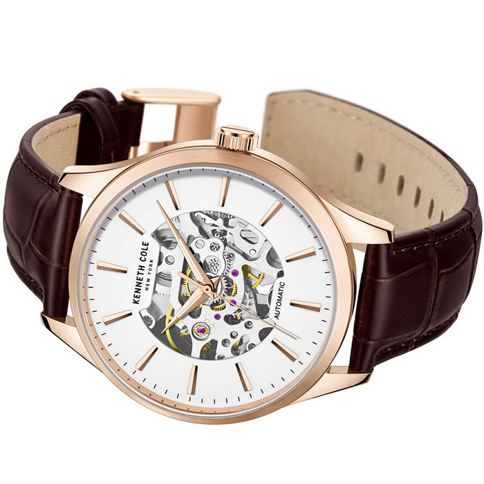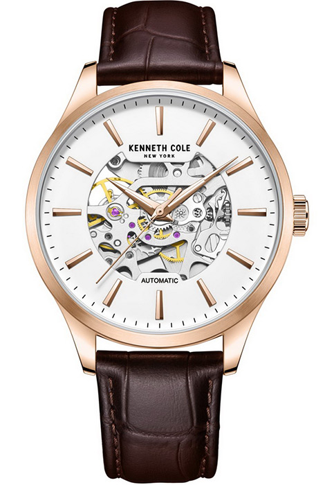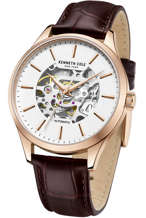 Мужские механические наручные часы с автоподзаводом Kenneth Cole KCWGE2216901 коллекции Automatic. Данные часы необходимо носить для обеспечения их правильного хода, так как в часах не используется батарейка, а механизм заводится при движении руки. Вращаясь, полукруглый ротор приводит в движение заводную пружину. Скелетонизированный циферблат демонстрирует всю красоту и сложность механизма, превращая его в элемент, украшающий часы. Кожаный ремешок. Прозрачный циферблат и задняя крышка. На корпус нанесено стойкое PVD покрытие. Водонепроницаемость WR (3 атм).