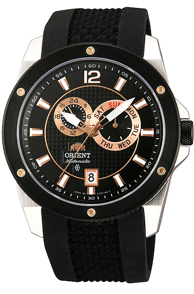 Мужские механические наручные часы с автоподзаводом Orient ET0H002B коллекции Multi Function. Калибр механизма — ET(46B). Запас хода более 40-ка часов. Количество камней - 21. На данной модели отображается дата, день недели и время суток (24-х часовая шкала). Стрелки и метки покрыты люминесцентным напылением (светятся в темноте). Корпус частично покрыт PVD покрытием розового цвета. Завинчивающаяся заводная головка и задняя крышка для более уверенной водонепроницаемости часов. Сапфировое стекло. Прозрачная задняя крышка.