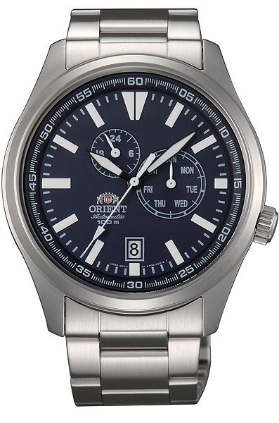 Мужские механические наручные часы с автоподзаводом Orient ET0N001D коллекции Multi Function. Калибр механизма — ET(46B). Запас хода более 40-ка часов. Количество камней - 21. На данной модели отображается дата, день недели и время суток (24-х часовая шкала). Стрелки и метки покрыты люминесцентным напылением (светятся в темноте). Завинчивающаяся заводная головка и задняя крышка для более уверенной водонепроницаемости часов. Водонепроницаемость WR100 (10 атм)