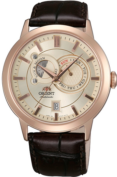 Мужские механические наручные часы с автоподзаводом Orient ET0P001W коллекции Multi Function. Калибр механизма — ET(46B). Запас хода более 40-ка часов. Количество камней - 21. На данной модели отображается дата, день недели и время суток (день/ночь). На корпус нанесено PVD покрытие розового цвета. Прозрачная завинчивающаяся задняя крышка. Сапфировое стекло.