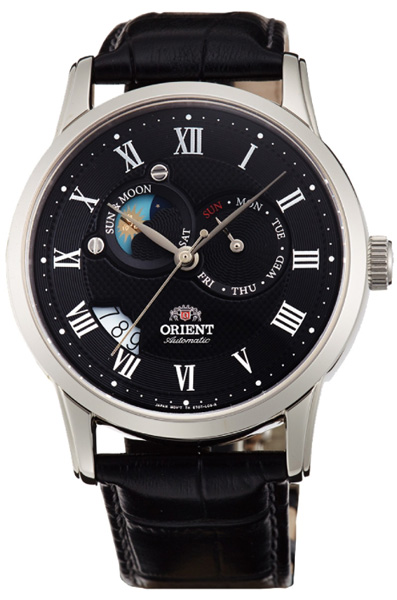 Мужские механические наручные часы с автоподзаводом Orient ET0T002B коллекции Multi Function. Калибр механизма — ET(46B). Запас хода более 40-ка часов. Количество камней - 21. На данной модели отображается дата, день недели и время суток (день/ночь). Прозрачная завинчивающаяся задняя крышка. Сапфировое стекло.