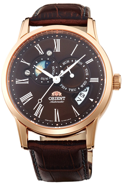 Мужские механические наручные часы с автоподзаводом Orient ET0T003T коллекции Multi Function. Калибр механизма — ET(46B). Запас хода более 40-ка часов. Количество камней - 21. На данной модели отображается дата, день недели и время суток (день/ночь). На корпус нанесено PVD покрытие розового цвета. Прозрачная завинчивающаяся задняя крышка. Сапфировое стекло.