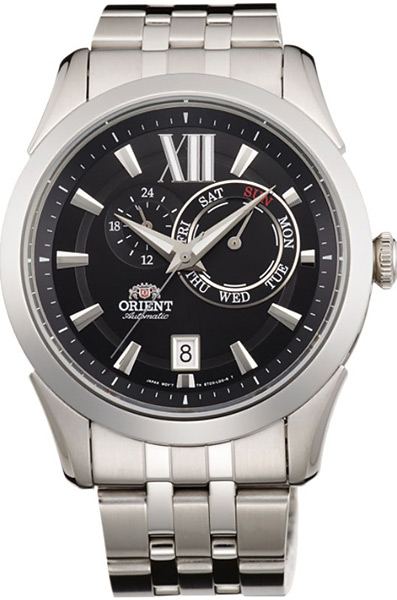 Мужские механические наручные часы с автоподзаводом Orient ET0X004B (FET0X004B0) коллекции Multi Function. Калибр механизма — ET(46B). Запас хода более 40-ка часов. Количество камней - 21. На данной модели отображается дата, день недели и время суток (24-х часовая шкала). Стрелки покрыты люминесцентным напылением (светятся в темноте). Завинчивающаяся задняя крышка для более уверенной водонепроницаемости часов. Водонепроницаемость WR50 (5 атм).