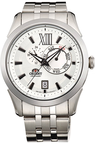 Мужские механические наручные часы с автоподзаводом Orient ET0X005W (FET0X005W0) коллекции Multi Function. Калибр механизма — ET(46B). Запас хода более 40-ка часов. Количество камней - 21. На данной модели отображается дата, день недели и время суток (24-х часовая шкала). Стрелки покрыты люминесцентным напылением (светятся в темноте). Завинчивающаяся задняя крышка для более уверенной водонепроницаемости часов.