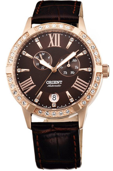 Женские механические наручные часы с автоподзаводом Orient ET0Y001T (FET0Y001T0) коллекции Multi Function. Калибр механизма — ET(46B). Запас хода более 40-ка часов. Количество камней - 21. На данной модели отображается дата, день недели и время суток (24-х часовая шкала). Корпус и циферблат украшен камнями. На корпус нанесено PVD покрытие.