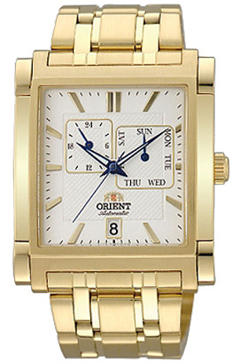 Мужские механические наручные часы с автоподзаводом Orient ETAC001W коллекции Multi Function. Калибр механизма — ET(46B). Запас хода более 40-ка часов. Количество камней - 21. На данной модели отображается дата, день недели и время суток (24-х часовая шкала). Стрелки и метки покрыты люминесцентным напылением (светятся в темноте). На корпус и браслет нанесено PVD покрытие желтого цвета.