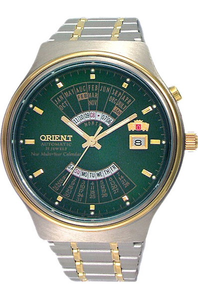 Мужские механические наручные часы с автоподзаводом Orient EU00000F (FEU00000FH) коллекции Multi-Year Calendar. Калибр механизма — EU(46D). Запас хода более 40-ка часов. Количество камней - 21. В данной модели присутствует функция вечного календаря, с помощью нее, синхронизируя текущий год с текущем месяцем, на циферблате отображается календарь целого месяца. Стрелки и метки покрыты люминесцентным напылением (светятся в темноте). На корпус и браслет частично нанесено PVD покрытие желтого цвета. Завинчивающаяся задняя крышка часов. Водонепроницаемость WR50 (5 атм).