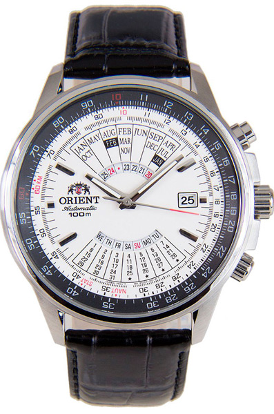 Мужские механические наручные часы с автоподзаводом Orient EU0700DW (FEU0700DWH) коллекции Multi-Year Calendar. Калибр механизма — EU(46D). Запас хода более 40-ка часов. Количество камней - 21. В данной модели присутствует функция вечного календаря, с помощью нее, синхронизируя текущий год с текущем месяцем, на циферблате отображается календарь целого месяца. Стрелки и метки покрыты люминесцентным напылением (светятся в темноте). Завинчивающаяся задняя крышка заводная головка для более уверенной водонепроницаемости часов. Внутренний вращающийся безель с логарифмической линейкой. Водонепроницаемость WR100 (10 атм).