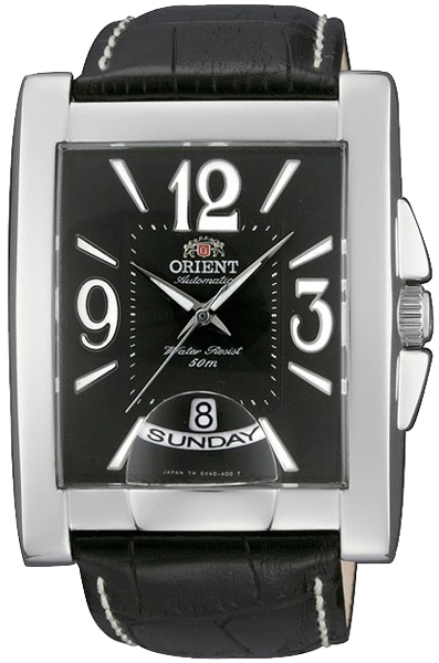 Мужские механические наручные часы с автоподзаводом Orient EVAD001B (FEVAD001BT) коллекции Wide Calendar. Калибр механизма — EV(46E). Запас хода более 40-ка часов. Количество камней - 21. На данной модели день недели отображается в полноформатном исполнении, а так же отображается дата. Стрелки и метки покрыты люминесцентным напылением (светятся в темноте). Водонепроницаемость WR50 (5 атм).