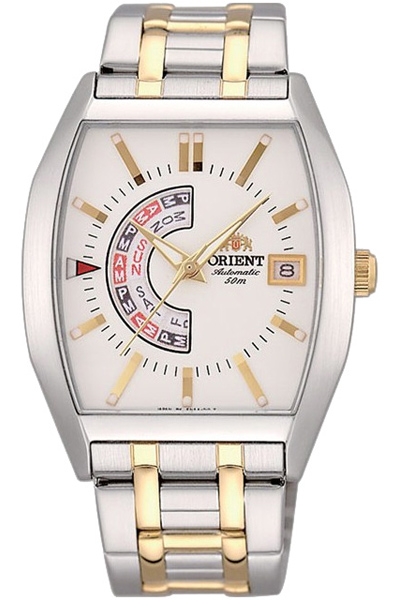 Мужские механические наручные часы с автоподзаводом Orient FNAA003W (FFNAA003WH) коллекции Automatic. Калибр механизма — FN(46V). Запас хода более 40-ка часов. Количество камней - 21. На данной модели отображается дата и день недели, а так же время до полудня и после полудня (AM и PM). На корпус и браслет частично нанесено стойкое PVD покрытие. Стрелки и метки покрыты люминесцентным напылением (светятся в темноте). Водонепроницаемость WR50 (5 атм).