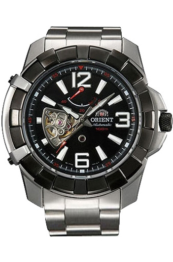 Мужские механические наручные часы с автоподзаводом Orient FT03002B (FFT03002B0) коллекции Power Reserve. Калибр механизма — FT(46R). Запас хода более 40-ка часов. Количество камней - 21. На циферблате прозрачное окошко, через него частично видно работу механизма. Установлен ретроградный индикатор запаса хода. Стрелки и метки покрыты люминесцентным напылением (светятся в темноте). Сапфировое стекло. На корпус частично нанесено стойкое PVD покрытие. Завинчивающаяся прозрачная задняя крышка и заводная головка. Водонепроницаемость WR100 (10 атм).