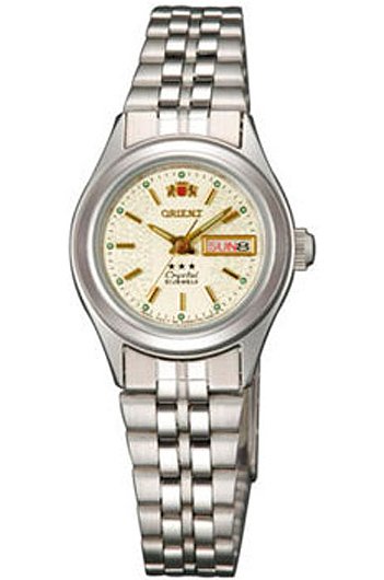 Женские механические наручные часы с автоподзаводом и возможностью ручного завода Orient NQ04005W (FNQ04005W6). Калибр механизма — NQ(559). Запас хода более 40-ка часов. Количество камней - 21. На данной модели отображается дата и день недели. Стрелки и метки покрыты люминесцентным напылением (светятся в темноте). Завинчивающаяся задняя крышка.
