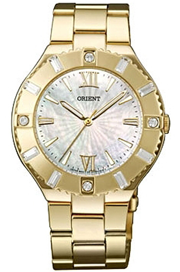 Женские кварцевые наручные часы Orient QC0D003W (FQC0D003W0). Калибр механизма — QС(RH5). Перламутровый циферблат. Стрелки и метки покрыты люминесцентным напылением (светятся в темноте). На корпус и браслет нанесено стойкое PVD покрытие, а так же корпус часов украшен камнями из циркона.