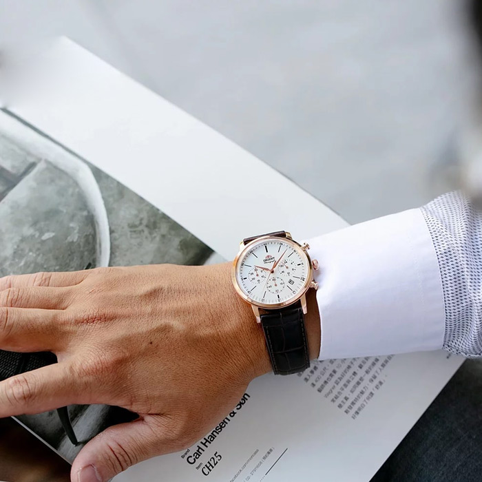 Мужские кварцевые наручные часы с хронографом (секундомером) Orient RA-KV0403S (RA-KV0403S10B). Калибр механизма — KV. На данной модели отображается дата и время суток (24-х часовая шкала). Секундомер может отсчитывать до 30-ти минут. Ремешок — телячья кожа. Сферическое стекло. На корпус нанесено стойкое PVD покрытие. Водонепроницаемость WR50 (5 атм).