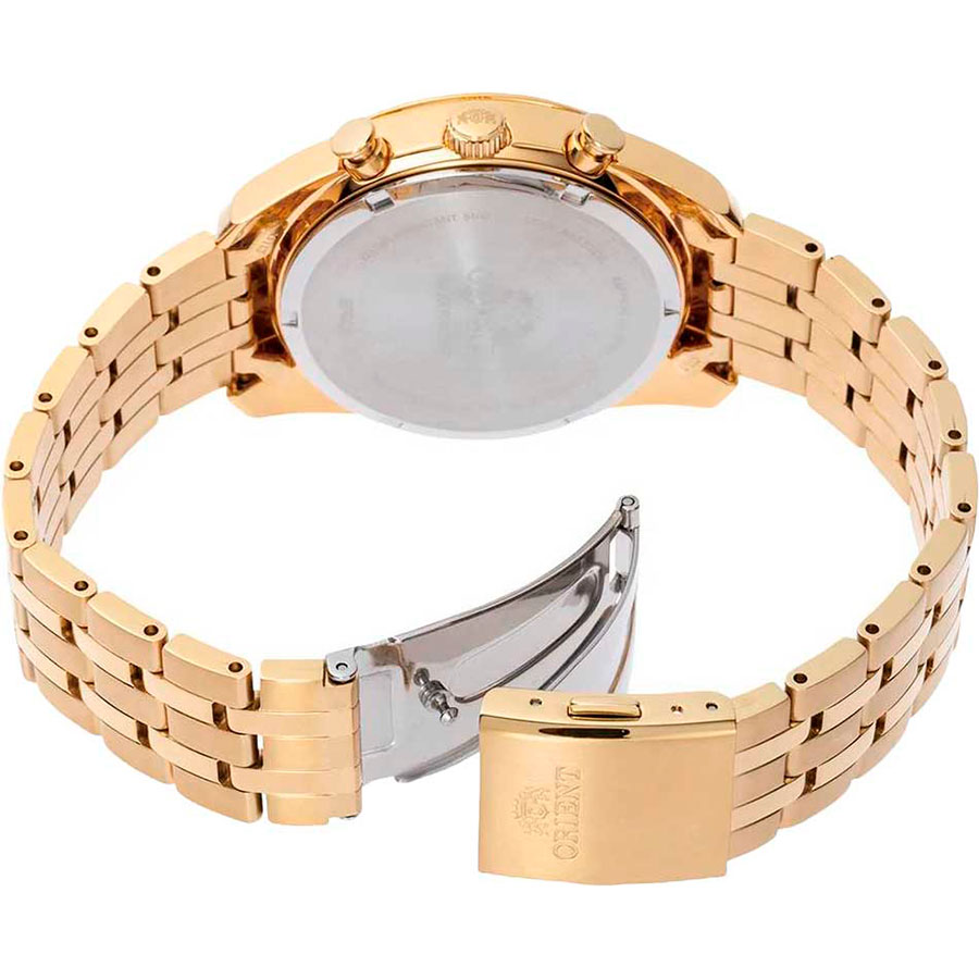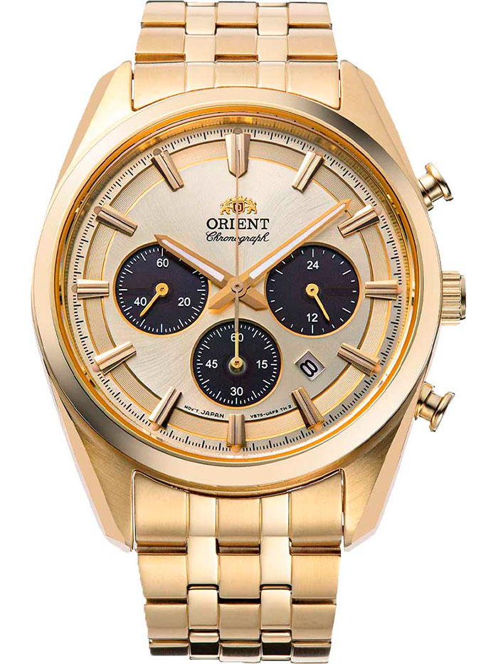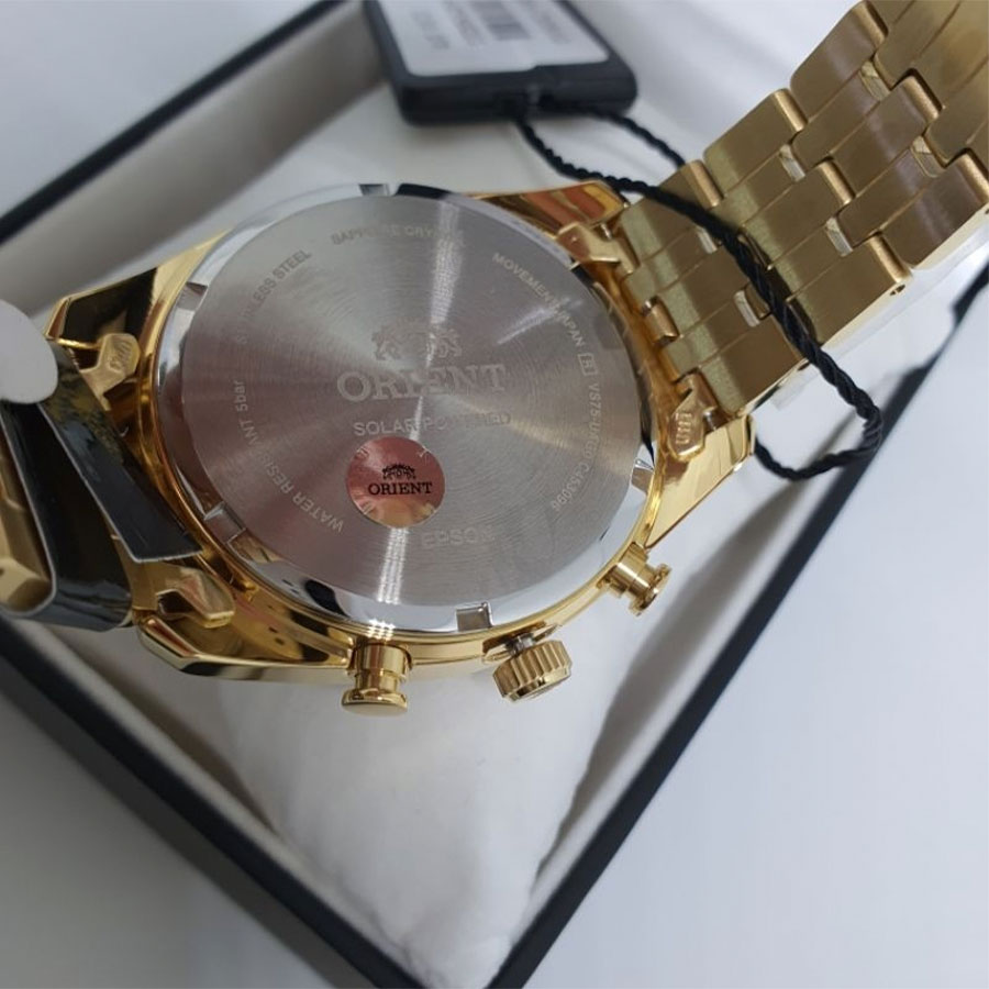 Мужские кварцевые наручные часы на солнечной батарее с хронографом (секундомером) Orient RA-TX0301G Chronograph Solar. Калибр механизма — VS752. Аккумулятор данной модели заряжается от любого источника света. Срок работы аккумулятора с полным зарядом — около 180 дней. Примерный срок службы аккумулятора — 10 лет. Присутствует функция информирования о недостаточном заряде. На данной модели отображается дата и время суток (24-х часовая шкала). Секундомер может отсчитывать до 60-ти минут. Установлено сапфировое стекло устойчивое к появлению царапин. Стрелки и метки покрыты люминесцентным напылением (светятся в темноте). Завинчивающаяся задняя крышка. На корпус и браслет нанесено стойкое PVD покрытие. Водонепроницаемость WR50 (5 атм).