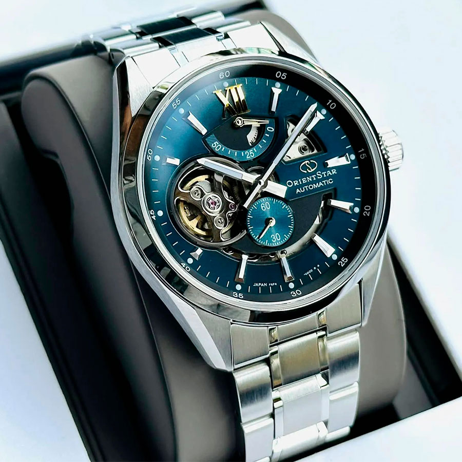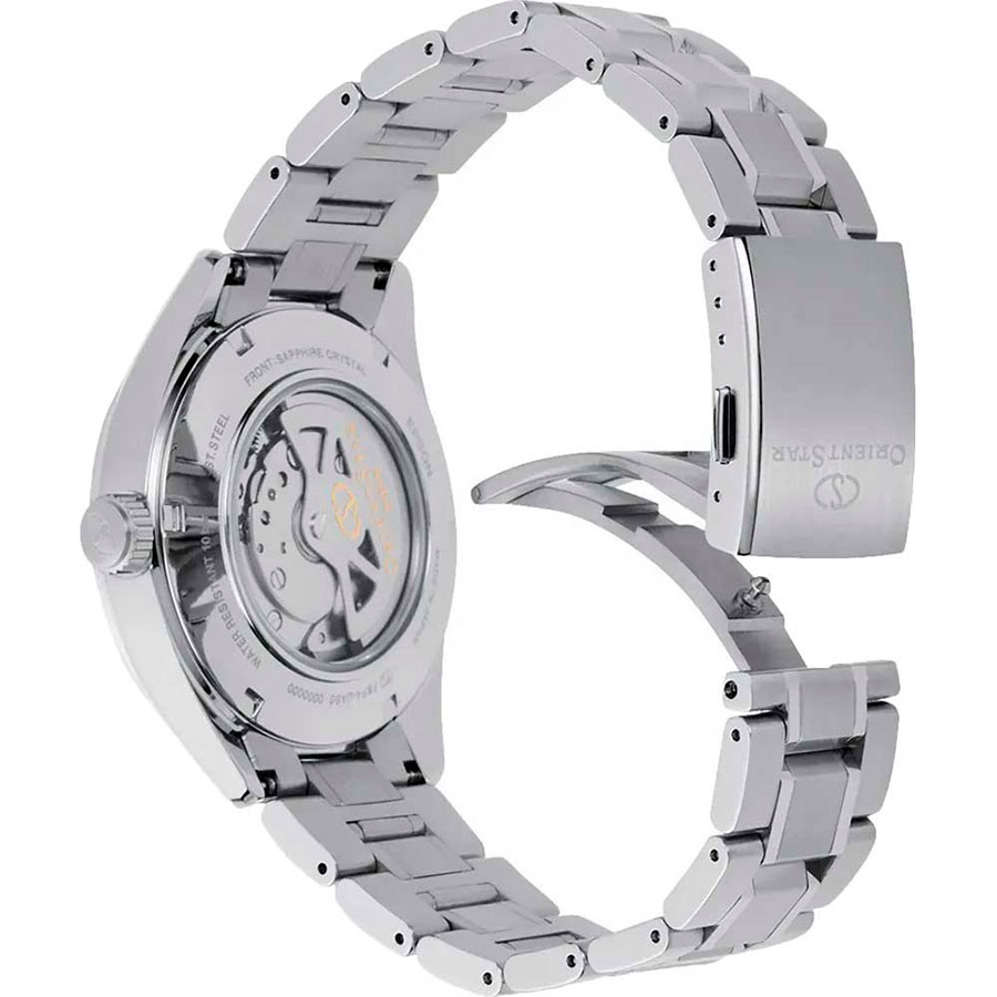 Мужские механические наручные часы с автоподзаводом и возможностью ручного завода Orient Star RK-AV0114E коллекции Contemporary. Калибр механизма — F6F44. Запас хода до 50-ти часов. 21 600 полуколебаний в час. Количество камней - 24. На циферблате установлен ретроградный индикатор запаса хода, а так же на циферблате расположено прозрачное окошко, через которое частично видно работу механизма. Стрелки и метки покрыты люминесцентным напылением (светятся в темноте). Функция стоп-секунда (остановка секундной стрелки для установки точного времени). Элементы корпуса отполированы вручную по технологии Zaratsu. Прозрачная завинчивающаяся задняя крышка. Установлено устойчивое к царапинам сапфировое стекло с антибликовым покрытием. Японская сборка (Made In Japan). Водонепроницаемость WR100 (10 атм).