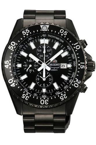Мужские кварцевые наручные часы с хронографом (секундомером) Orient TT11001B (STT11001B0). Калибр механизма — TT(KFB). Секундомер может отсчитывать до 12 часов с шагом 1/20 секунды, так же на циферблате часов присутствует шкала тахиметра для измерения средней скорости движения. На данной модели отображается дата. Стрелки и метки покрыты люминесцентным напылением (светятся в темноте). На корпус и браслет нанесено PVD покрытие черного цвета. Завинчивающаяся заводная головка и задняя крышка для более уверенной водонепроницаемости часов. Вращающийся безель. Японская сборка. Водонепроницаемость WR200 (20 атм).