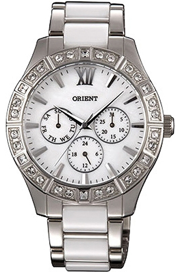 Женские кварцевые наручные часы Orient SW01004W (FSW01004W0) с браслетом из керамики. Калибр механизма — SW. На данной модели отображается дата, день недели и время суток (24-х часовая шкала). Браслет изготовлен из керамики и стали. Корпус украшен камнями из циркона.
