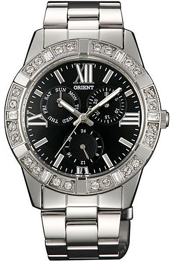 Женские кварцевые наручные часы Orient SX07005B (FSX07005B0). Калибр механизма — SX(KUB). Стрелки покрыты люминесцентным напылением (светятся в темноте). На данной модели отображается дата, день недели и время суток. Корпус часов украшен камнями из циркона.