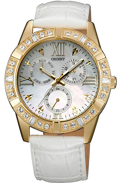 Женские кварцевые наручные часы Orient SX07007W (FSX07007W0). Калибр механизма — SX(KUB). Стрелки и метки покрыты люминесцентным напылением (светятся в темноте). На данной модели отображается дата, день недели и время суток. Корпус часов украшен камнями из циркона, а также на корпус нанесено стойкое PVD покрытие.