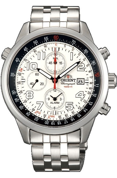 Мужские кварцевые наручные часы с хронографом (секундомером) и будильником Orient TD09008W (FTD09008W0). Калибр механизма — TD(KFA). Секундомер может отсчитывать до 60 минут с шагом 1/5 секунды. Внутренний вращающийся безель с логарифмической линейкой. Будильник может быть установлен в течение ближайших 12 часов. На данной модели отображается дата. Сапфировое стекло с анти бликовым покрытием. Стрелки и метки покрыты люминесцентным напылением (светятся в темноте). Завинчивающаяся задняя крышка для более уверенной водонепроницаемости часов. Водонепроницаемость WR100 (10 атм).