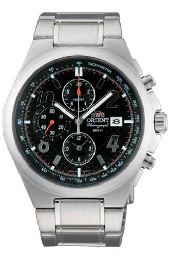 Мужские кварцевые наручные часы с хронографом (секундомером) Orient TT0C003B. Калибр механизма — TT(KFB). Секундомер может отсчитывать до 12 часов с шагом 1/20 секунды, так же на циферблате часов присутствует шкала тахиметра для измерения средней скорости движения. На данной модели отображается дата. Стрелки и метки покрыты люминесцентным напылением (светятся в темноте). Завинчивающаяся задняя крышка.