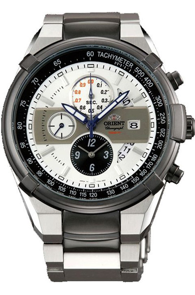 Мужские кварцевые наручные часы с хронографом (секундомером) Orient TT0J003W (FTT0J003W0). Калибр механизма — TT(KFB). Секундомер может отсчитывать до 12 часов с шагом 1/20 секунды, так же на циферблате часов присутствует шкала тахиметра для измерения средней скорости движения. На данной модели отображается дата. Стрелки и метки покрыты люминесцентным напылением (светятся в темноте). На корпус данной модели частично нанесено PVD покрытие черного цвета. Завинчивающаяся заводная головка и задняя крышка для более уверенной водонепроницаемости часов. Водонепроницаемость WR100 (10 атм)