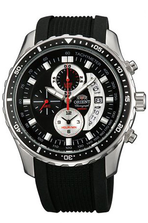 Мужские кварцевые наручные часы с хронографом (секундомером) Orient TT0Q003B. Калибр механизма — TT(KFB). Секундомер может отсчитывать до 12 часов с шагом 1/20 секунды, так же на циферблате часов присутствует шкала тахиметра для измерения средней скорости движения. На данной модели отображается дата. Стрелки и метки покрыты люминесцентным напылением (светятся в темноте). На корпус данной модели частично нанесено PVD покрытие черного цвета. Завинчивающаяся заводная головка и задняя крышка для более уверенной водонепроницаемости часов. Вращающийся безель.