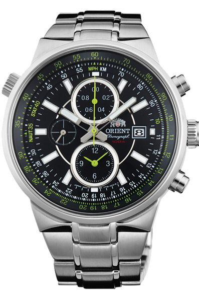 Мужские кварцевые наручные часы с хронографом (секундомером) Orient TT15001B (FTT15001B0). Калибр механизма — TT(KFB). Секундомер может отсчитывать до 12 часов с шагом 1/20 секунды. Внутренний вращающийся безель со шкалой тахиметра для измерения средней скорости движения. На данной модели отображается дата. Стрелки и метки покрыты люминесцентным напылением (светятся в темноте). Завинчивающаяся заводная головка и задняя крышка для более уверенной водонепроницаемости часов. Водонепроницаемость WR100 (10 атм).