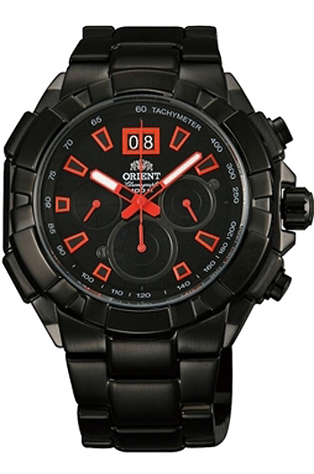 Мужские кварцевые наручные часы с хронографом (секундомером) и большим индикатором даты Orient TV00004B (FTV00004B0). Калибр механизма — TV(KFC). Секундомер может отсчитывать до 60 минут с шагом 1/5 секунды. Индикация времени суток до\после полудня (24 часа), так же на циферблате часов присутствует шкала тахиметра для измерения средней скорости движения. Стрелки и метки покрыты люминесцентным напылением (светятся в темноте). На корпус и браслет данной модели нанесено стойкое PVD покрытие черного цвета. Завинчивающаяся заводная головка и задняя крышка для более уверенной водонепроницаемости часов. Водонепроницаемость WR100 (10 атм).
